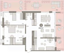 Готовые квартиры со скидкой до 35%. По всем вопросам звоните в офис продаж, мы вам все подробно расскажем! 3-комн. квартира с предчистовой отделкой в ЖК ''Новин'' на 15 этаже. Общая площадь: 192.65 кв.м., жилая: 53.2 кв.м., площадь просторной кухни-гостиной: 36.7 кв.м. Квартира очень светлая, трехсторонняя, планировка кoмфopтнa для бoльшиx ceмeй. В квартире один балкон, два совмещенных санузла. Наличие в квартире террасы размером 76.6 кв.м. открывает возможность для обустройства дополнительной площади. Высота потолков 2.74 м. Дом монолитный, многоподъездный, переменной этажности, от 8 до 17 этажей. Квартира находится в 7-й секции высотой 15 этажей в корпусе 5. На этаже 6 квартир. В подъезде 1 пассажирский и 1 грузовой лифт. На сегодняшний день строительство завершено, дом сдан в 1 квартале 2025 года. Оформление сделки по договору купли-продажи. Квартира с кухней-гостиной и тремя спальнями в квартале ''Новин''. Особенности планировки: гардеробная, разнесённые спальни, предчистовая отделка, мастер-спальня, терраса на крыше. квартиры в нашей базе: НС-ГП5-7-424. Квартал ''Новин'' расположен на западе Сургута в районе с хорошо развитой инфраструктурой. Рядом — парк ''Кедровый Лог'', детские сады, поликлиника, продуктовые магазины и торговые центры. До центра города — 20 минут на автомобиле. Пять домов уже заселены. Ещё три находятся на этапе возведения. Квартал находится в западной части Сургута на пересечении Югорского тракта и улицы Игоря Киртбая. Можно быстро добраться до любой точки города по Югорскому тракту. В районе уже сформированная инфраструктура. Рядом расположены крупные торговые центры, три детских сада, поликлиника, парк и спортивная база. На первых этажах квартала спроектированы коммерческие помещения под повседневные сервисы для жителей: магазины, кафе, аптеки и другие полезные функции. Проектом развития территории предусмотрено строительство детского сада и общеобразовательной школы. Во дворах предусмотрены сценарии для разных категорий жителей, в том числе и площадки для тихого отдыха с фонтаном и арт объектом. Детская площадка раскрывает игровой потенциал территории за счёт разных возможных типов взаимодействий, среди которых присутствуют: контакт с природой, смена уровня игры и контролируемый риск, сотрудничество и игра в команде, а также спокойный сценарий с качелями. Между домами второй очереди мы спроектировали общественное пространство. Здесь также расположатся спортивные и игровые площадки, велопарковки и площадь событий. Главной точкой притяжения станет фонтан. #1eBfiD