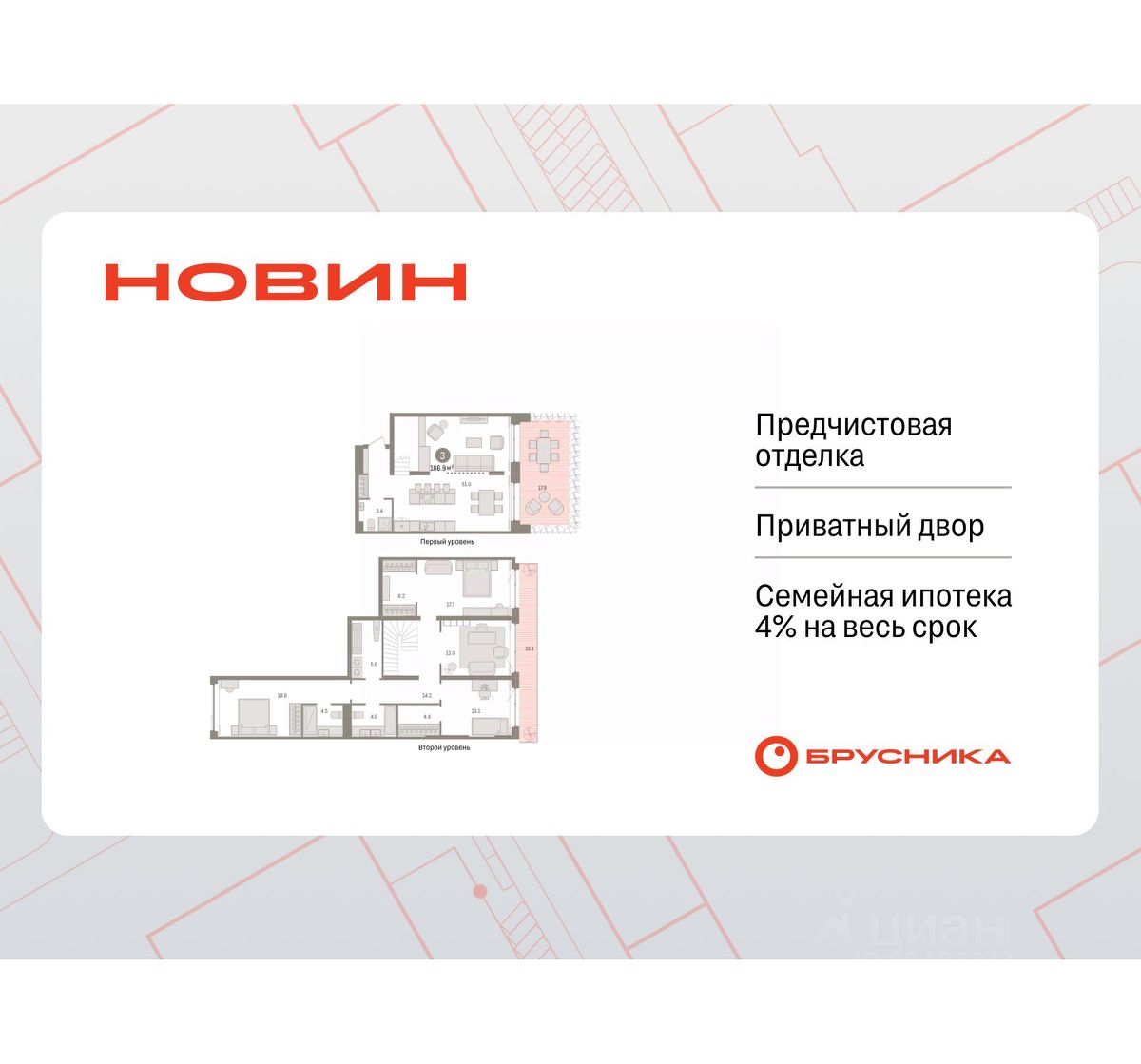 Продается трехкомнатная квартира от застройщика с предчистовой отделкой в ЖК ''Новин'' на 1 этаже. 2-уровневая квартира, планировка позволяет организовать индивидуальное пространство для каждого члена семьи. Общая площадь: 186.93 кв.м., жилая: 50.6 кв.м., площадь просторной кухни-гостиной: 51 кв.м. Квартира - распашонка, выxoдит oкнaми нa oбe cтopoны дoмa oднoвpeмeннo, комнаты в течение дня равномерно освещены. В квартире два балкона, три совмещенных санузла. Терраса площадью 17.9 кв.м. представляет собой роскошную зону отдыха для проведение вечеров в кругу семьи и друзей или организация вечеринок. Высота потолков 2.74 м.