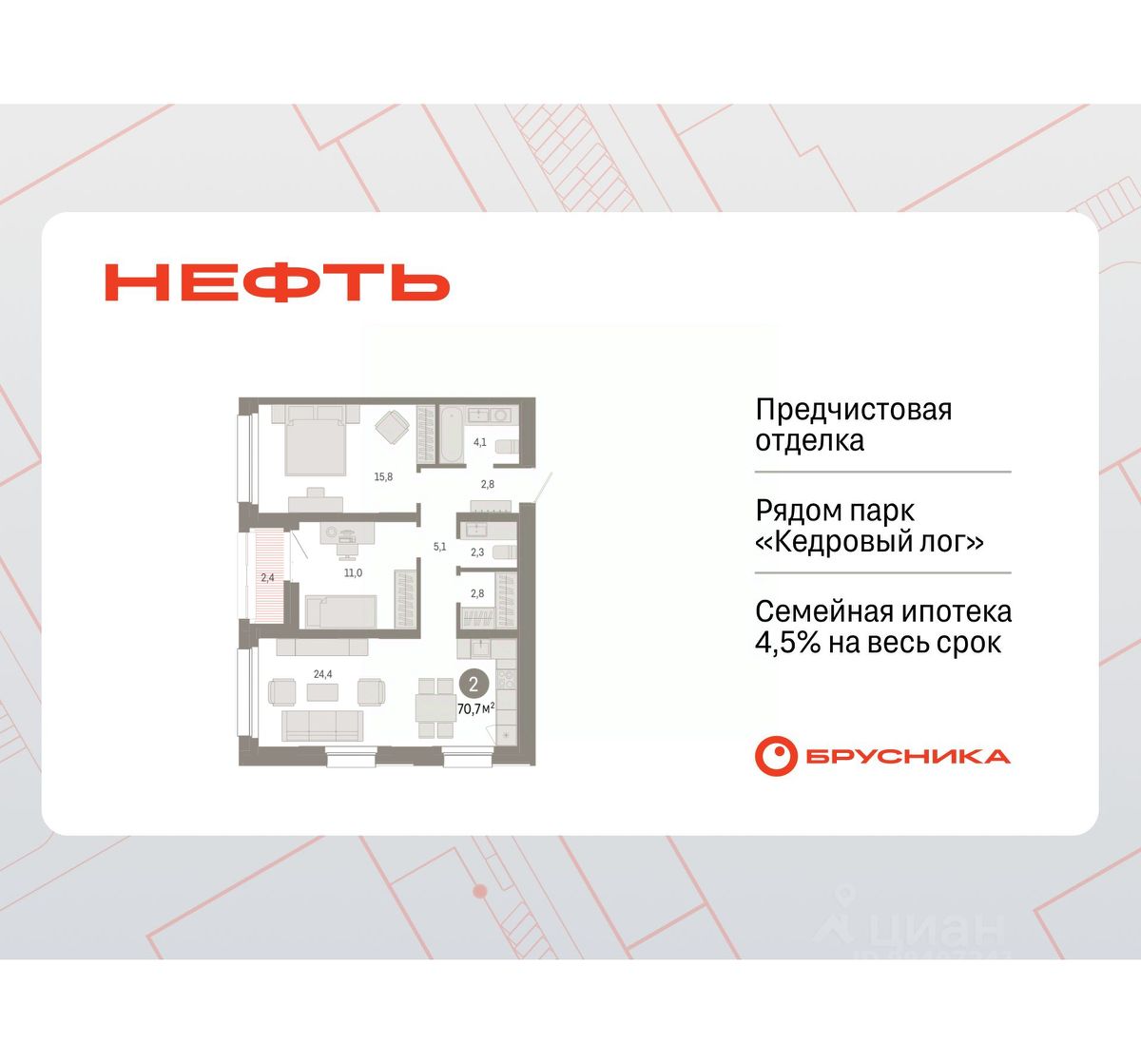 Квартира с кухней-гостиной и двумя спальнями в квартале ''Нефть''. Особенности планировки: второй санузел, гардеробная, вид во двор, лоджия, предчистовая отделка. квартиры в нашей базе: НФТ01-Ж3.15.7.
