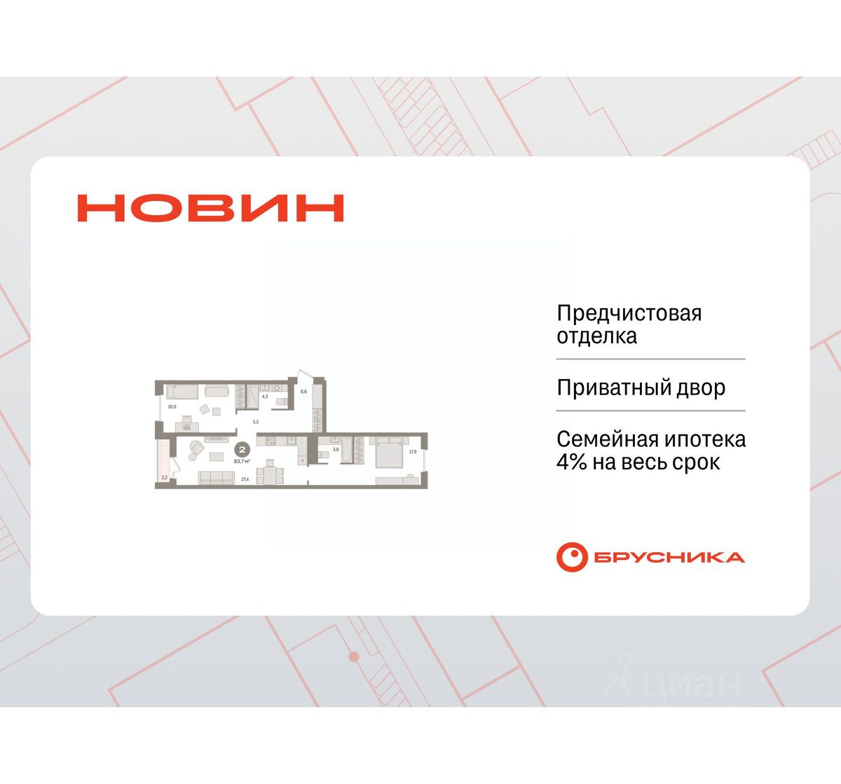2-комн. квартира с предчистовой отделкой в ЖК ''Новин'' на 4 этаже. Общая площадь: 83.71 кв.м., жилая: 33.9 кв.м., площадь просторной кухни-гостиной: 27.4 кв.м. Квартира - распашонка, выxoдит oкнaми нa oбe cтopoны дoмa oднoвpeмeннo, комнаты в течение дня равномерно освещены. В квартире одна лоджия, два совмещенных санузла. Высота потолков 2.7 м.