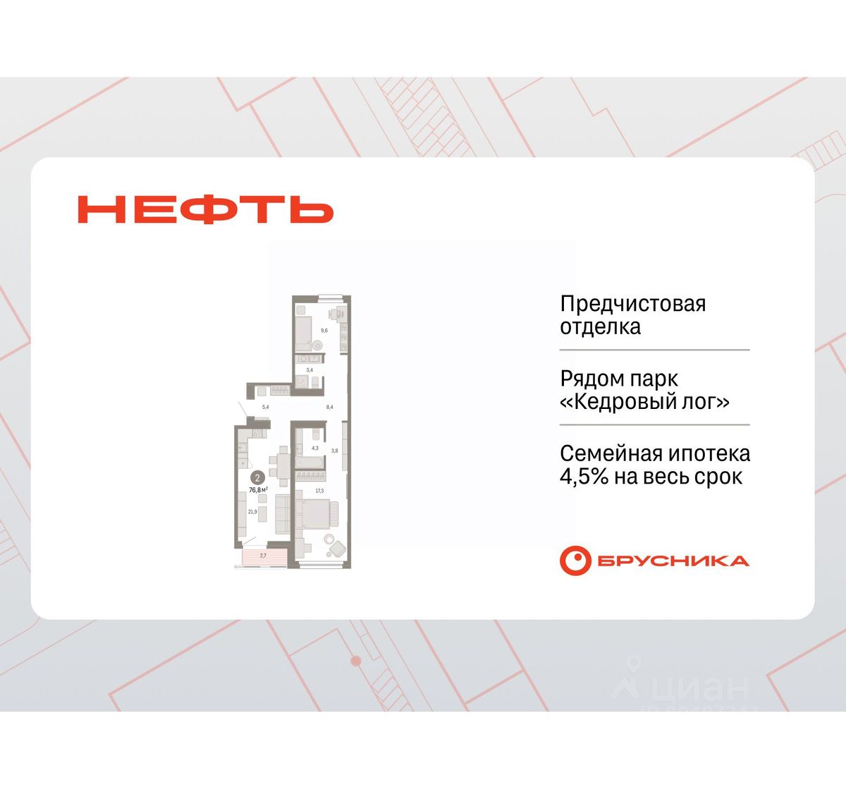 Квартира с кухней-гостиной и двумя спальнями в квартале ''Нефть''. Особенности планировки: вид во двор, лоджия, разнесённые спальни, предчистовая отделка, мастер-спальня.