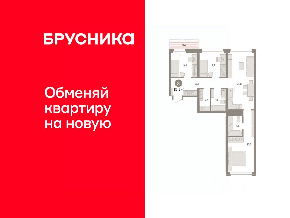 Квартира с кухней-гостиной и тремя спальнями в квартале ''Нефть''. Особенности планировки: балкон, окна на две стороны, предчистовая отделка, разнесённые спальни. квартиры в нашей базе: НФТ02-Ж5.4.1.