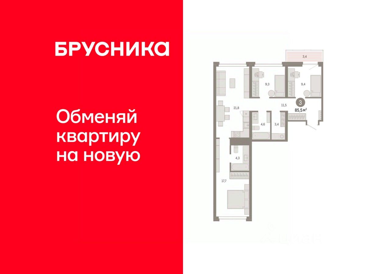 Квартира с кухней-гостиной и тремя спальнями в квартале ''Нефть''. Особенности планировки: балкон, окна на две стороны, предчистовая отделка, разнесённые спальни. квартиры в нашей базе: НФТ02-Ж5.3.5.