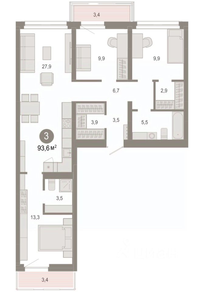 Квартира с кухней-гостиной и тремя спальнями в квартале ''Нефть''. Особенности планировки: балкон, окна на две стороны, предчистовая отделка, разнесённые спальни. квартиры в нашей базе: НФТ02-Ж2.3.1.