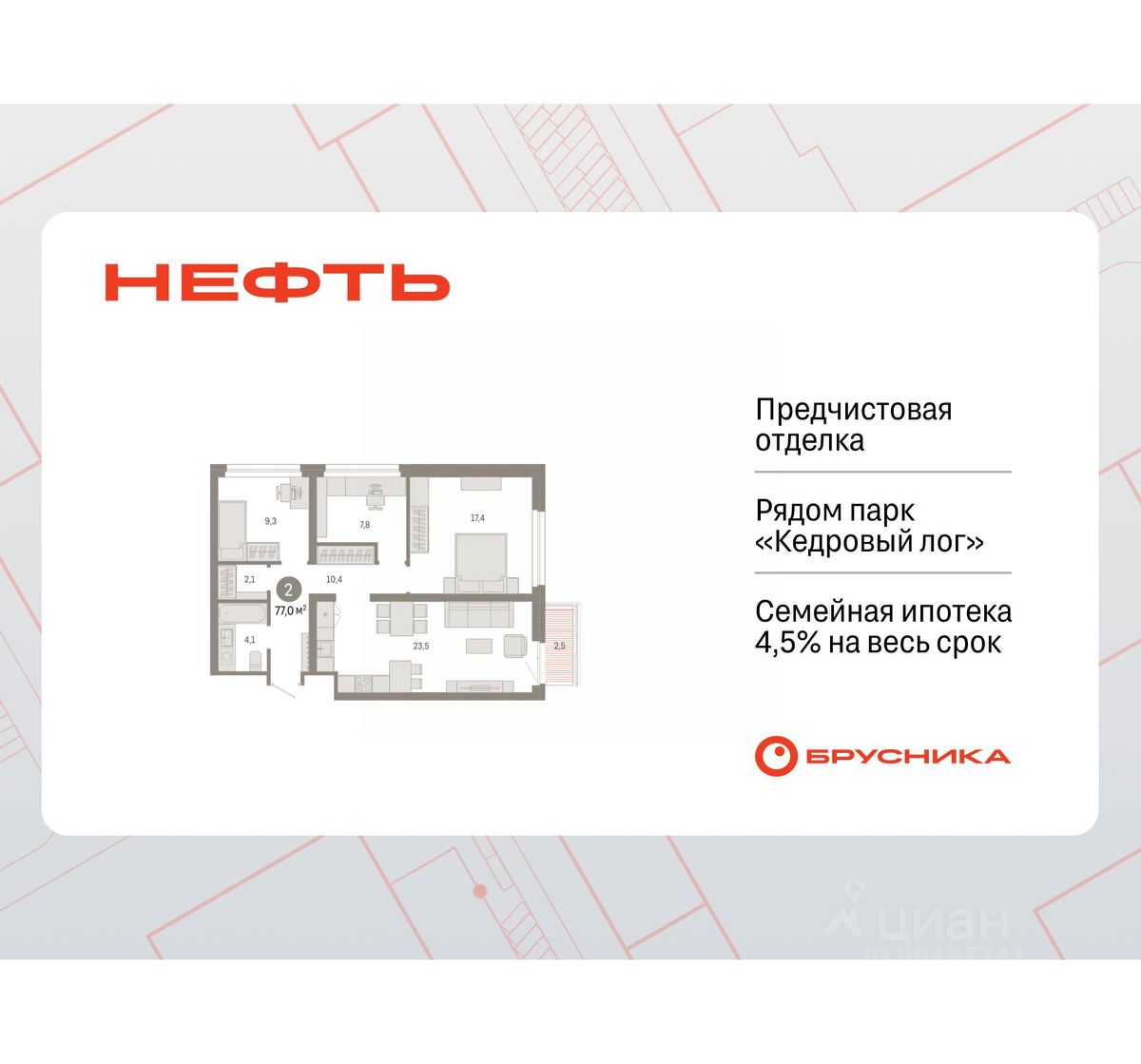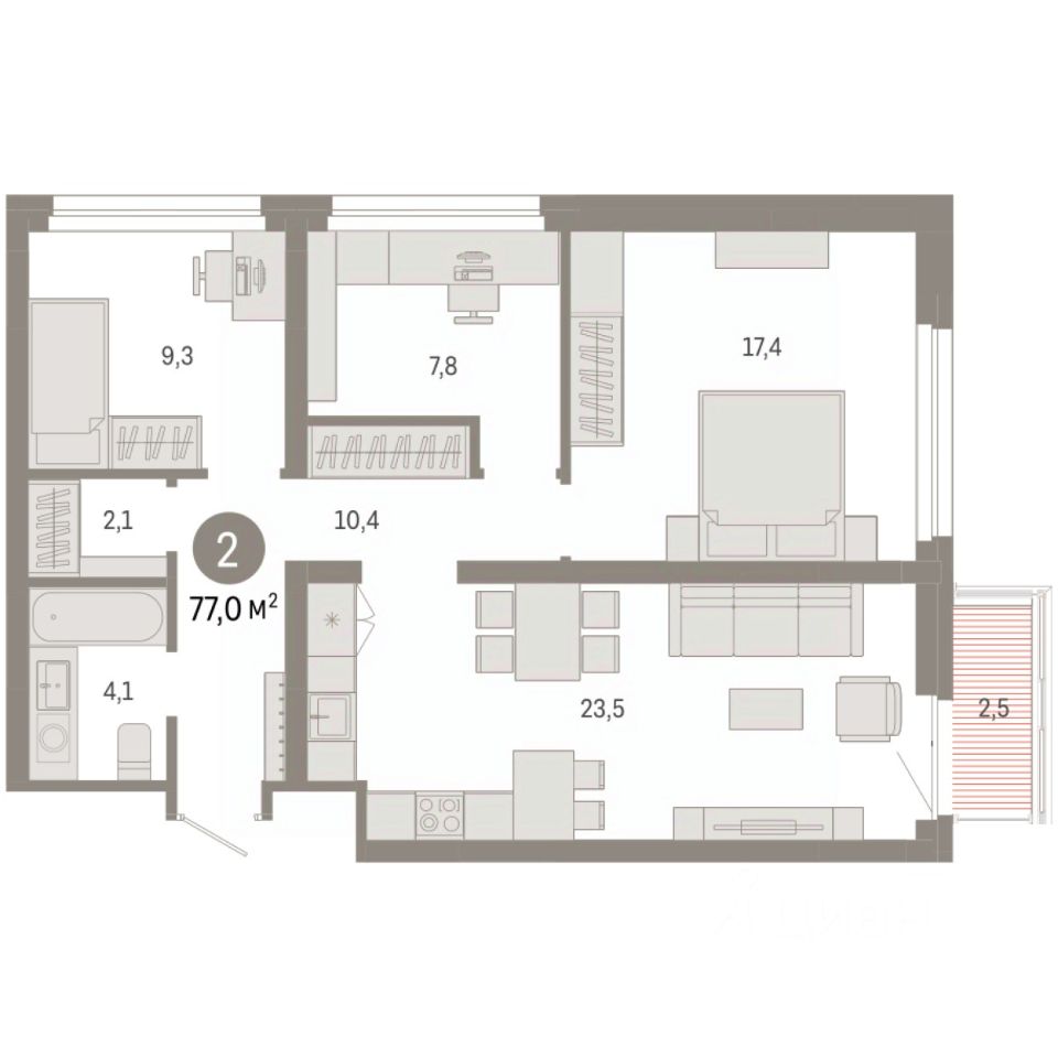Квартира с кухней-гостиной и двумя спальнями в квартале ''Нефть''. Особенности планировки: гардеробная, рабочий кабинет, лоджия, разнесённые спальни, предчистовая отделка. квартиры в нашей базе: НФТ02-Ж3.5.2.