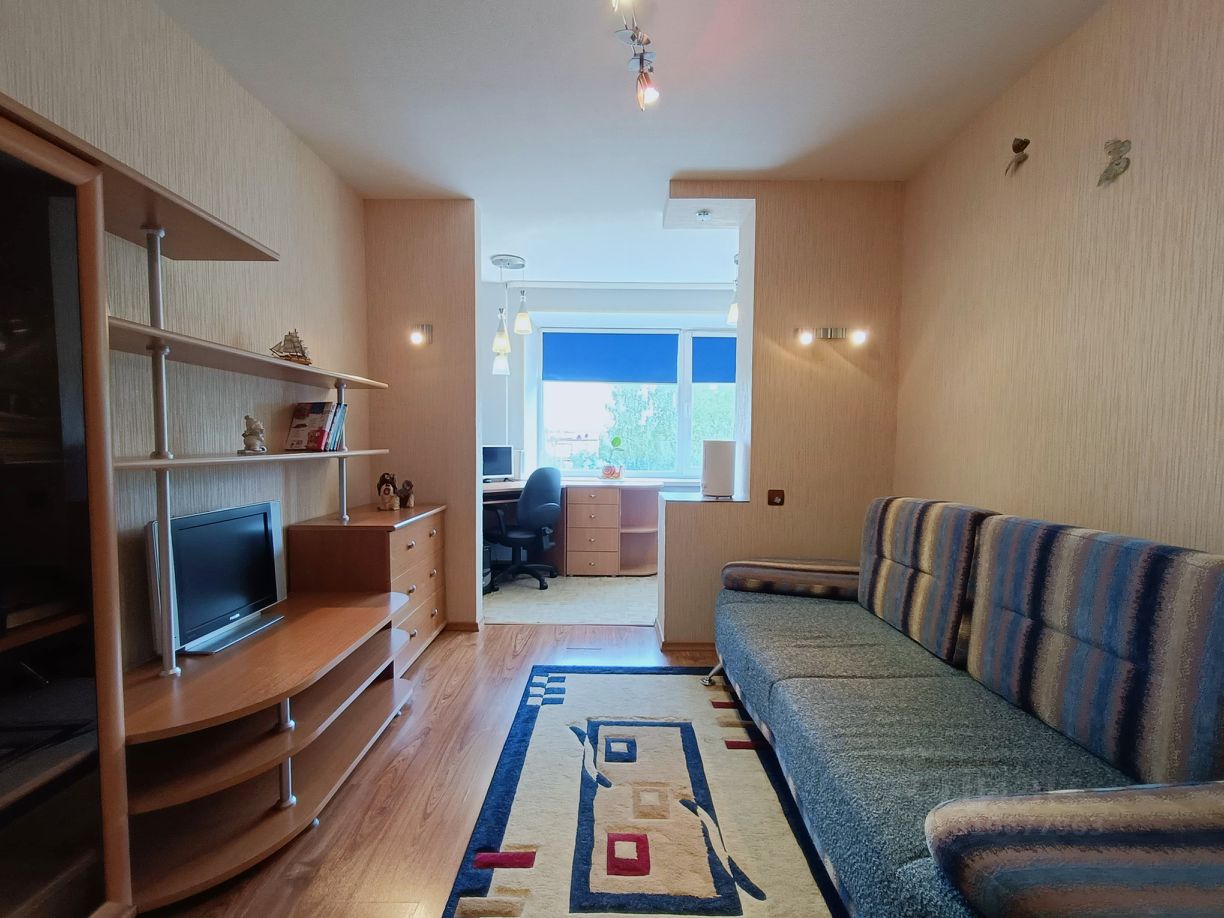 В квартире сделан косметический ремонт: - пол: заливной, застелен линолеумом, в комнате - ламинатом, в гостиной - ковролином, - стены: оклеены обоями, - потолок: декоративная потолочная плитка, в комнате - из гипсокартона, оклеенный обоями, - санузлы оклеяны обоями, - входная металлическая сейф-дверь.