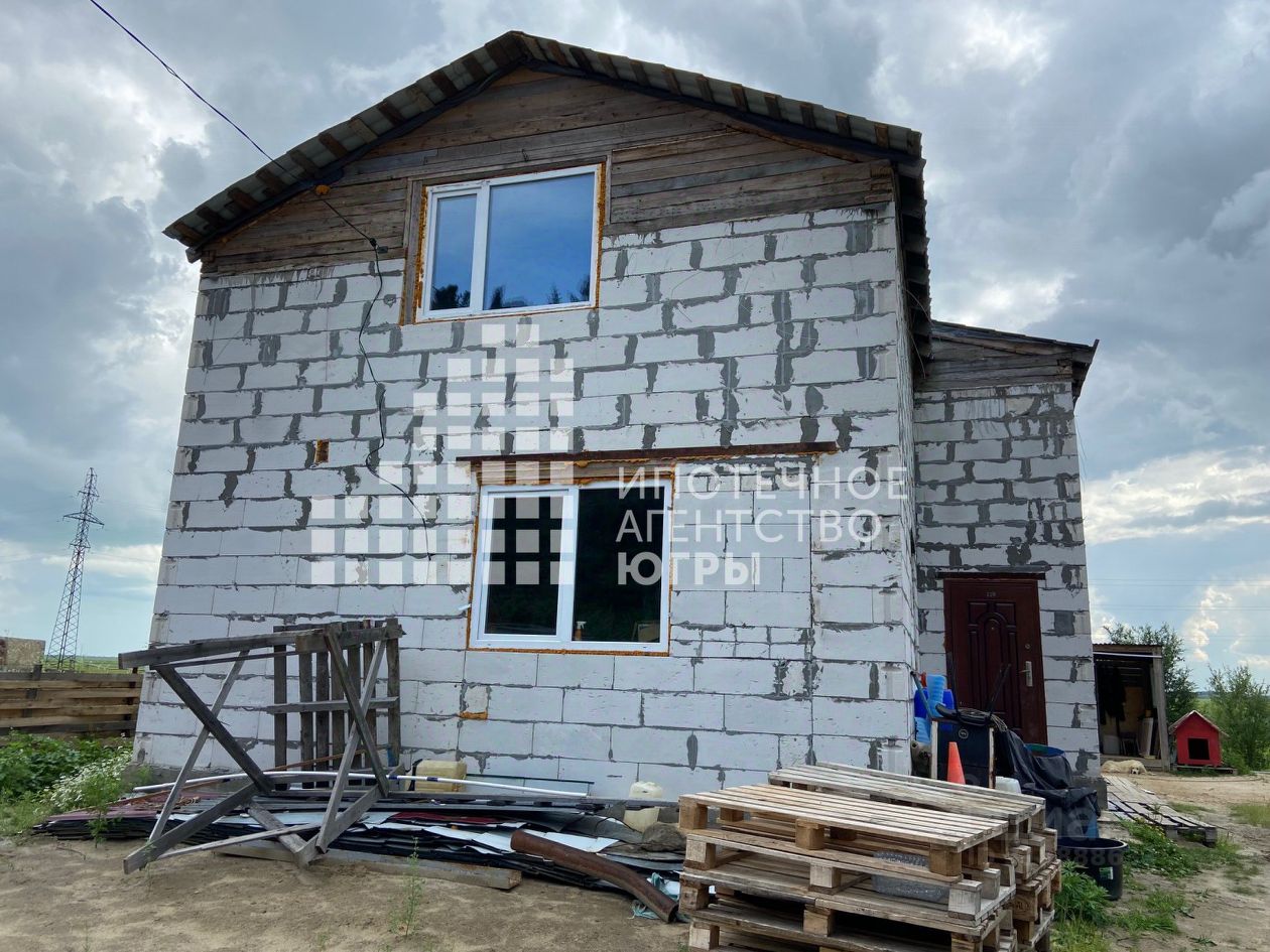 Дом двухэтажный с большой лоджией, общая площадь 124,8 кв. м. Строительство дома не завершено, а это значит, что у вас есть возможность обустроить интерьер по своему вкусу. Свайный фундамент залит вместе с плитой, материал стен — газобетонные блоки Паровит. В доме установлены пластиковые окна и радиаторы.