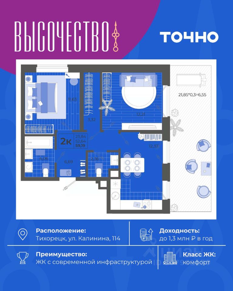 ''Высочество'' — первый ЖК комфорт-класса в Тихорецке. Современные технологии, новейшие представления о комфорте и эргономике жилья -это, то, что характеризует этот комплекс. Расположен в самом центре города. ''Высочество'' — это полностью самостоятельный жилой комплекс, жителей которого порадуют закрытый и свободный от машин двор, коммерческая галерея, спортивные и детские площадки с перголами для отдыха, уютная мангальная зона. По периметру жилого комплекса - открытый бесплатный паркинг на 370 м/мест. Недалеко от ЖК ''Высочество'' находятся детский сад, школы-гимназии, поликлиника, торговый центр, в пешей доступности расположен любимый сквер жителей города ''Звездный''.