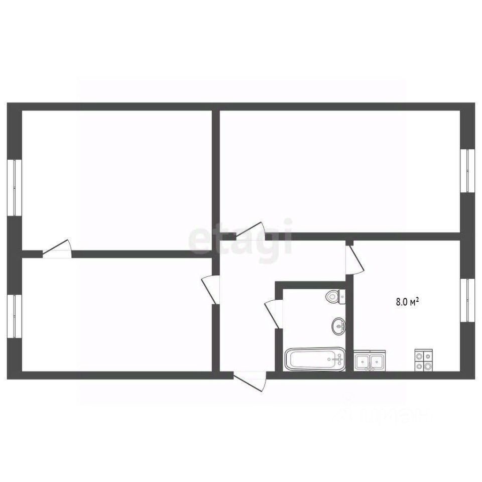 Планировка: Увеличили санузел за счет коридора (теперь просторный и совмещенный). Есть зал, кухня 8 м² и 2 изолированные спальни.