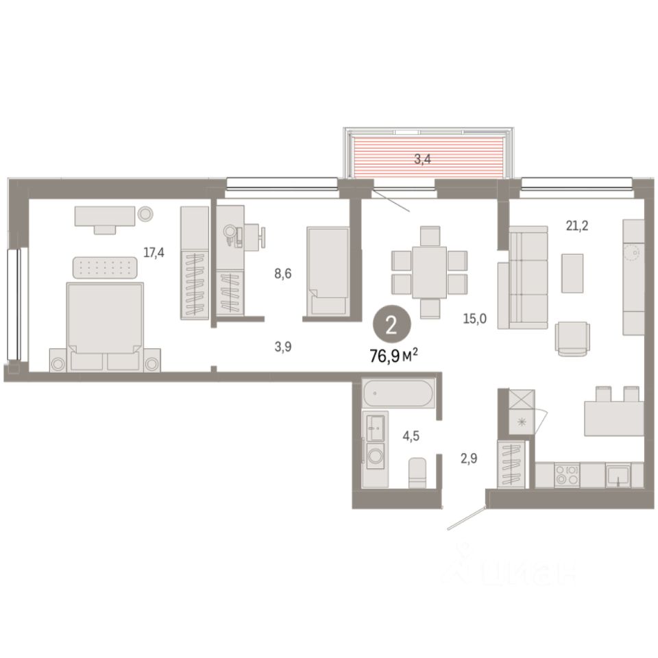 Квартира с кухней-гостиной и двумя спальнями в квартале ''Нефть''. Особенности планировки: балкон, предчистовая отделка, разнесённые спальни. квартиры в нашей базе: НФТ01-Ж1.6.8.