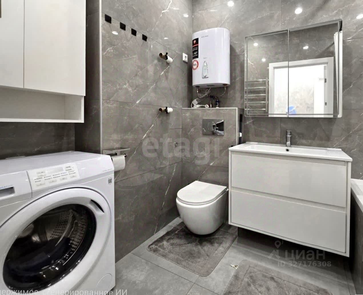 Ванная комната — пример сочетания эстетики и практичности. Навесной шкаф аккуратно скроет всё необходимое для хранения. Инсталляция и подвесная тумба под широкой раковиной облегчают уборку. Стены по периметру выложены широкоформатным керамогранитом — надёжность, долговечность и стиль в одном решении. Дополнительно установлен бойлер — горячая вода будет у Вас всегда, независимо от сезонных отключений.