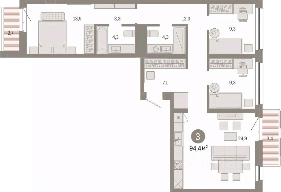 Квартира с кухней-гостиной и тремя спальнями в квартале ''Нефть''. Особенности планировки: балкон, вид во двор, лоджия, мастер-спальня, предчистовая отделка, разнесённые спальни. квартиры в нашей базе: НФТ01-Ж6.5.6.